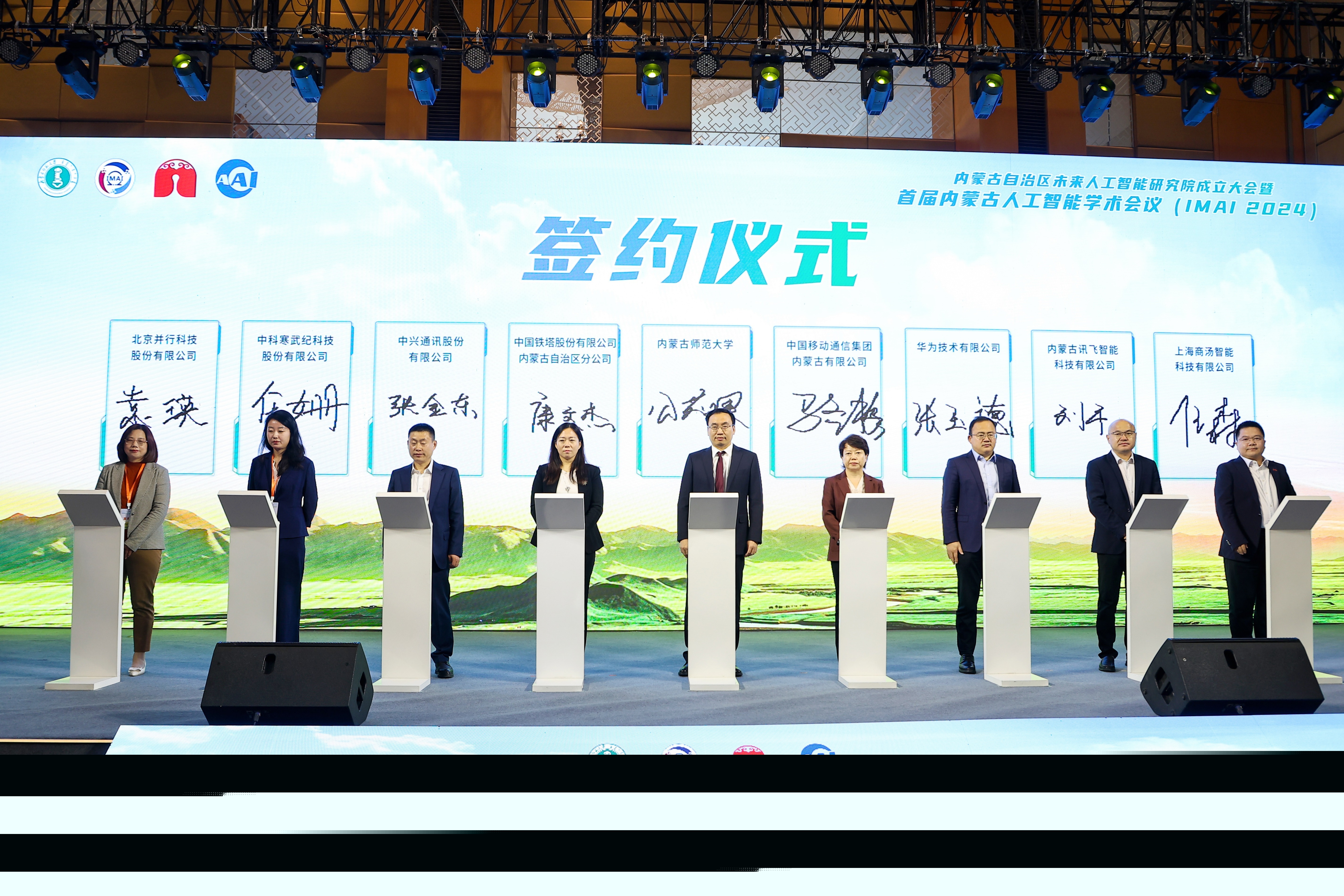 活動(dòng)現(xiàn)場(chǎng)揭牌成立了內(nèi)蒙古自治區(qū)未來(lái)人工智能研究院、中國(guó)人工智能學(xué)會(huì)內(nèi)蒙古分部、中國(guó)人工智能學(xué)會(huì)青年科學(xué)家俱樂(lè)部、內(nèi)蒙古自治區(qū)人工智能學(xué)會(huì)、內(nèi)蒙古師范大學(xué)未來(lái)科學(xué)與技術(shù)學(xué)院等重要教育和學(xué)術(shù)機(jī)構(gòu)。同時(shí),內(nèi)蒙古師范大學(xué)與中國(guó)移動(dòng)通信集團(tuán)內(nèi)蒙古有限公司、中國(guó)鐵塔內(nèi)蒙古分公司、華為、中興、科大訊飛、寒武紀(jì)、商湯科技、并行科技8家企業(yè)簽署戰(zhàn)略合作協(xié)議,雙方將在人才培養(yǎng)、科學(xué)研究、技術(shù)創(chuàng)新等多個(gè)領(lǐng)域展開(kāi)深度合作,共同探索“產(chǎn)學(xué)研用”?體化新模式。