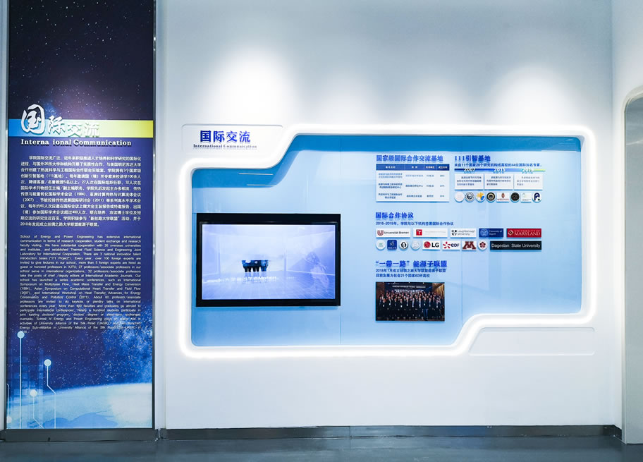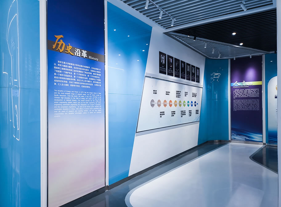 西安交通大學(xué)-能源與動(dòng)力學(xué)院展廳主要由展板和多媒體組成。在展廳設(shè)計(jì)上表現(xiàn)出簡(jiǎn)約大方,又要有特色,讓參觀者不僅在視覺(jué)上有更好的體驗(yàn),還能在互動(dòng)中對(duì)學(xué)校人工智能學(xué)院有深刻的了解。