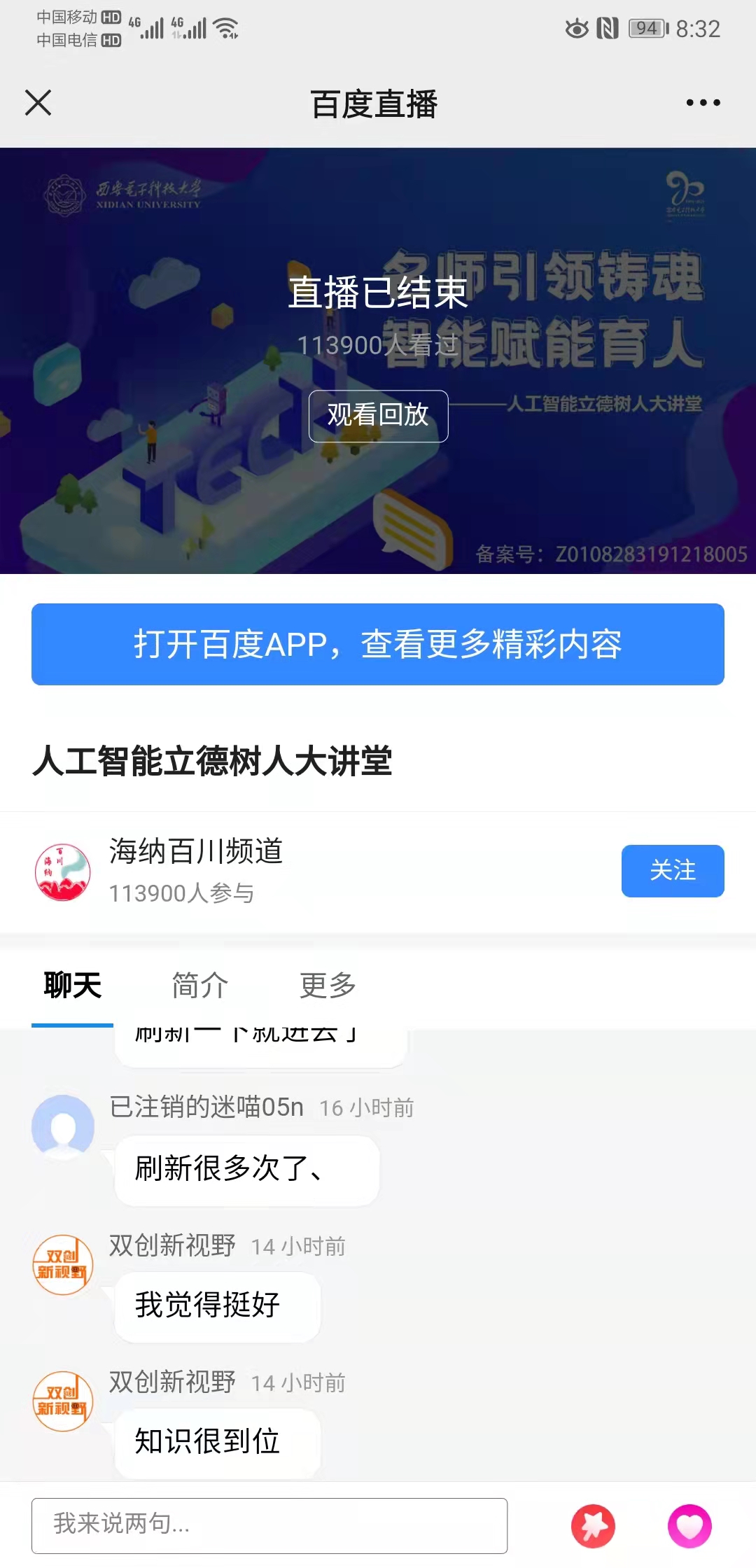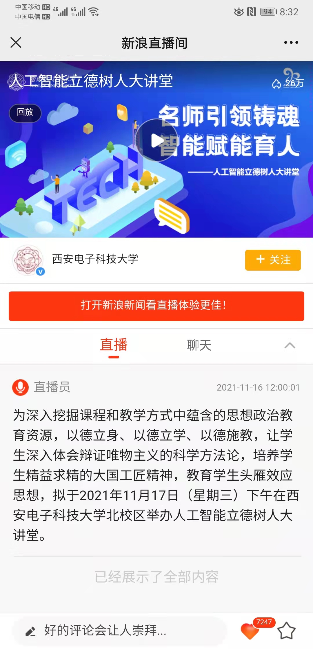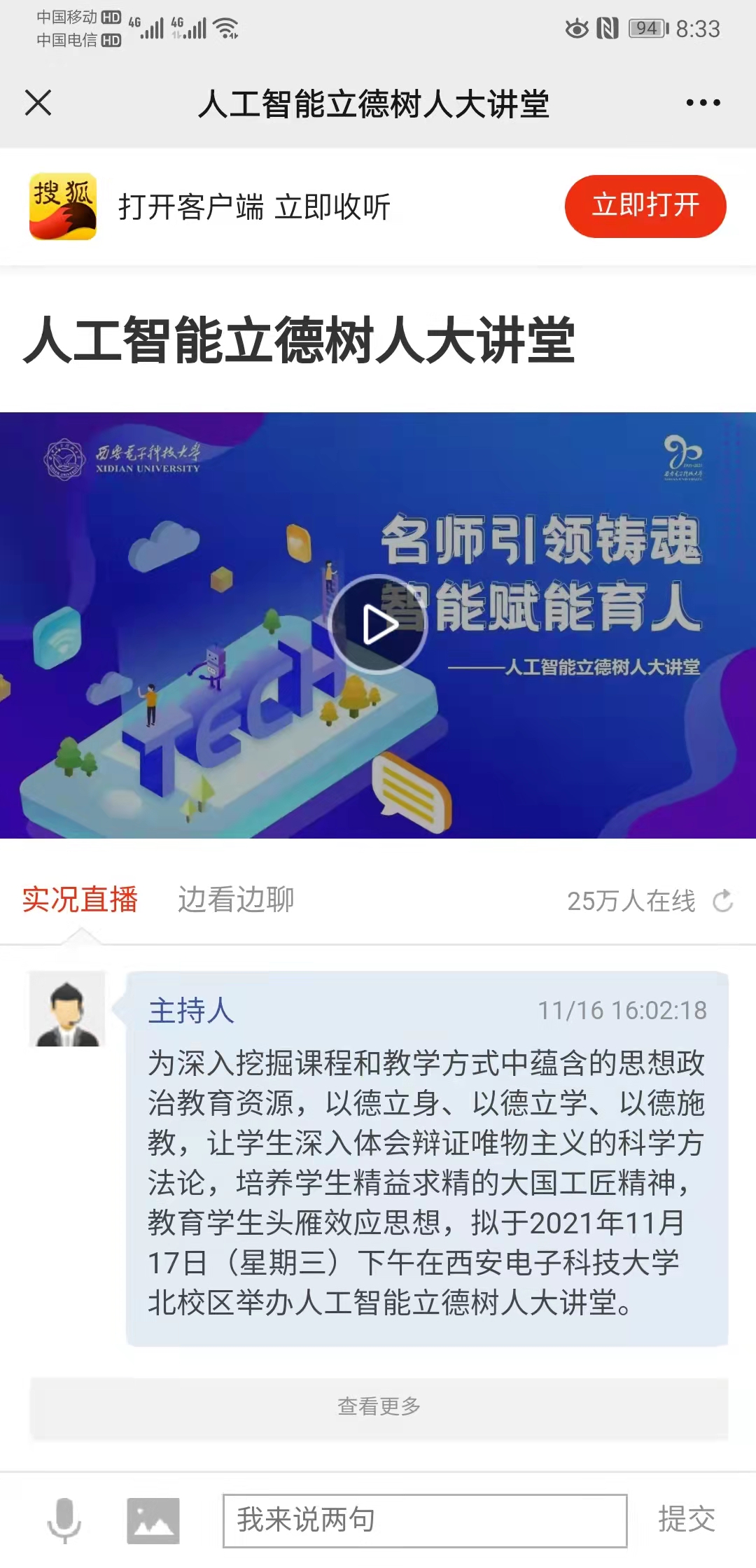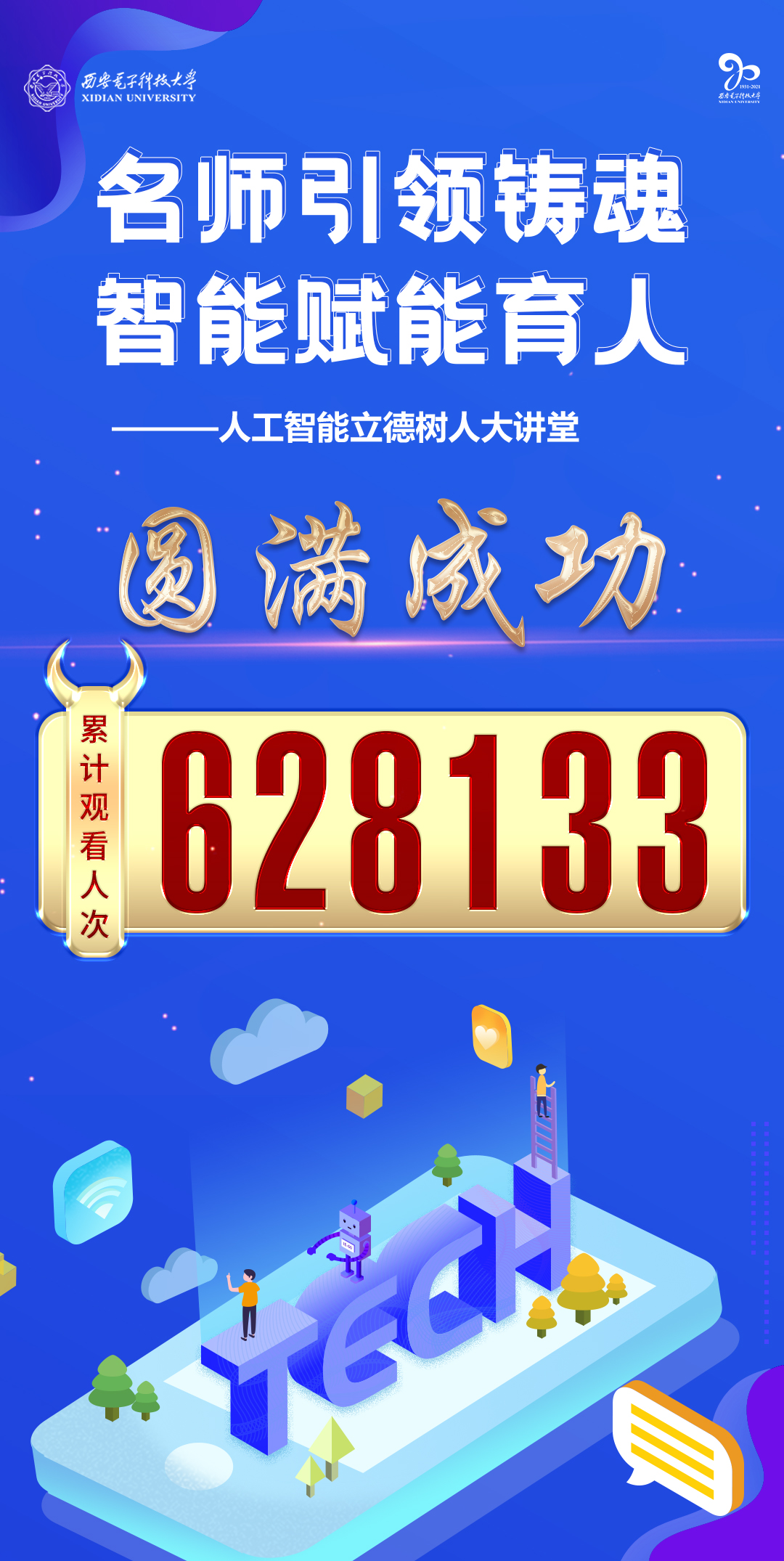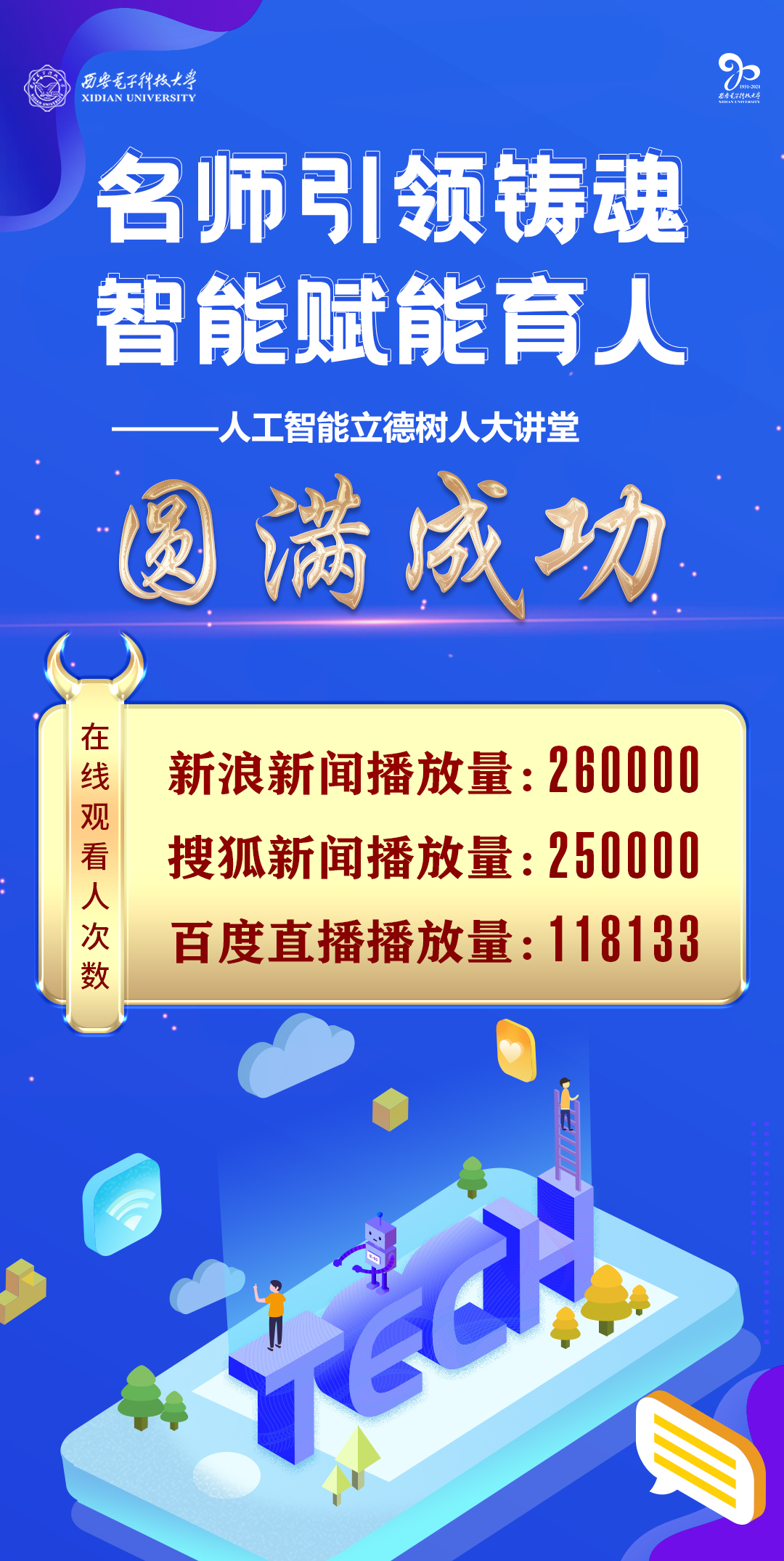 2021年11?17?,西安電?科技?學北校區(qū)舉辦??智能?德樹??講堂,線上同步進?直播,吸引超68萬?次在線觀看。