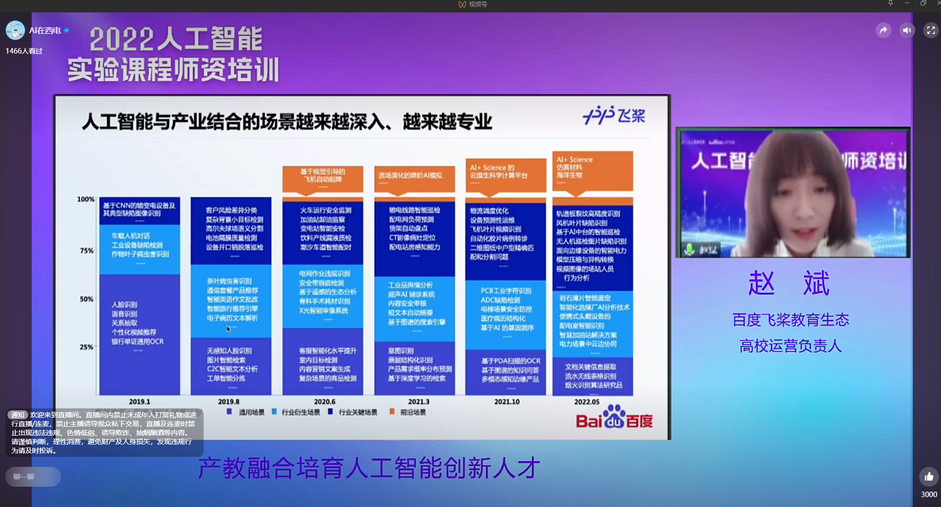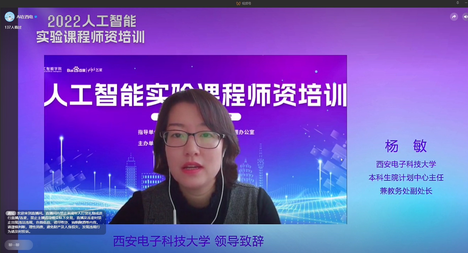 2022年11月19日,由重點(diǎn)領(lǐng)域教學(xué)資源建設(shè)項(xiàng)目管理辦公室指導(dǎo),西安電子科技大學(xué)和百度公司聯(lián)合主辦的人工智能實(shí)驗(yàn)課程師資培訓(xùn)活動在線上成功舉辦。來自全國各高校的人工智能專業(yè)一線教師、專業(yè)負(fù)責(zé)人、相關(guān)教學(xué)管理人員及產(chǎn)業(yè)界人士等匯聚云端,參加了此次會議,直播聯(lián)播觀看40萬余人。